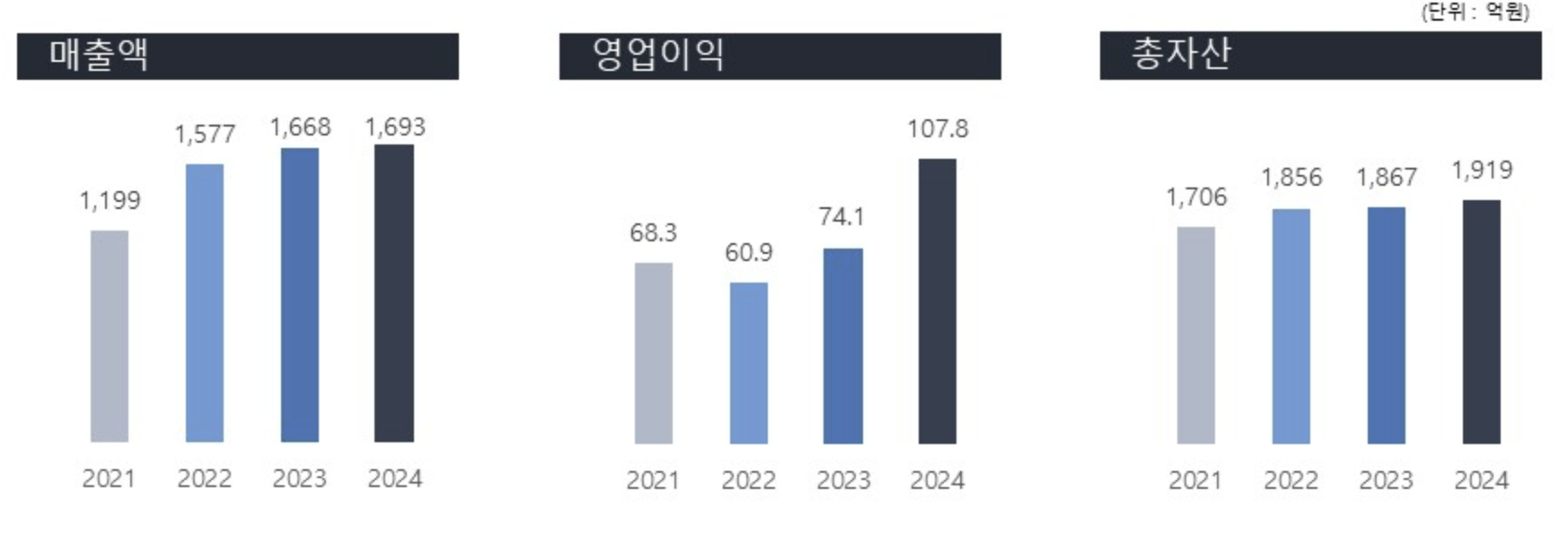 매출액은 2022년부터 2024년까지 큰 폭의 성장은 없었지만, 영업이익은 꾸준히 증가하고 있습니다. 특히 신사업을 시작했음에도 영업이익이 줄지 않았다는 점은 효율적인 운영과 기술력을 보여주는 지표입니다. 이는 향후 사업 확장에도 긍정적인 영향을 줄 수 있습니다.